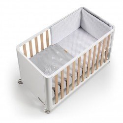 Si estás buscando la clásica cuna minimalista de estilo nórdico, esa que queda maravillosamente en cualquier habitación, es esta. La tienes en un blanco impoluto o en una combinación de dicho tono con la madera natural. Una ardillita da a tu bebé las buenas noches desde el lateral, y sus cuatro ruedas facilitan su traslado.