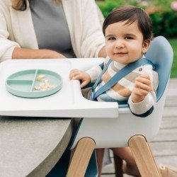 El innovador diseño de la bandeja encaja directamente sobre la mesa para que el bebé pueda acompañaros en la comida, siempre.