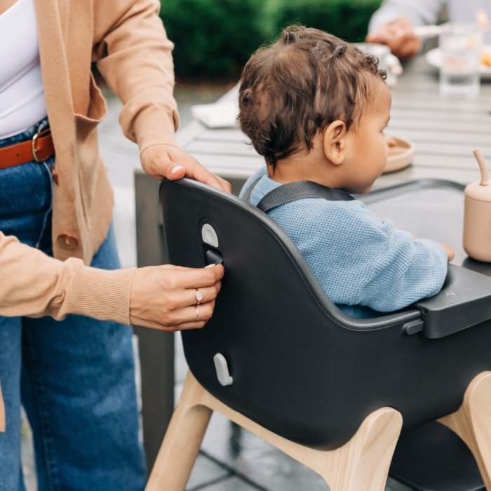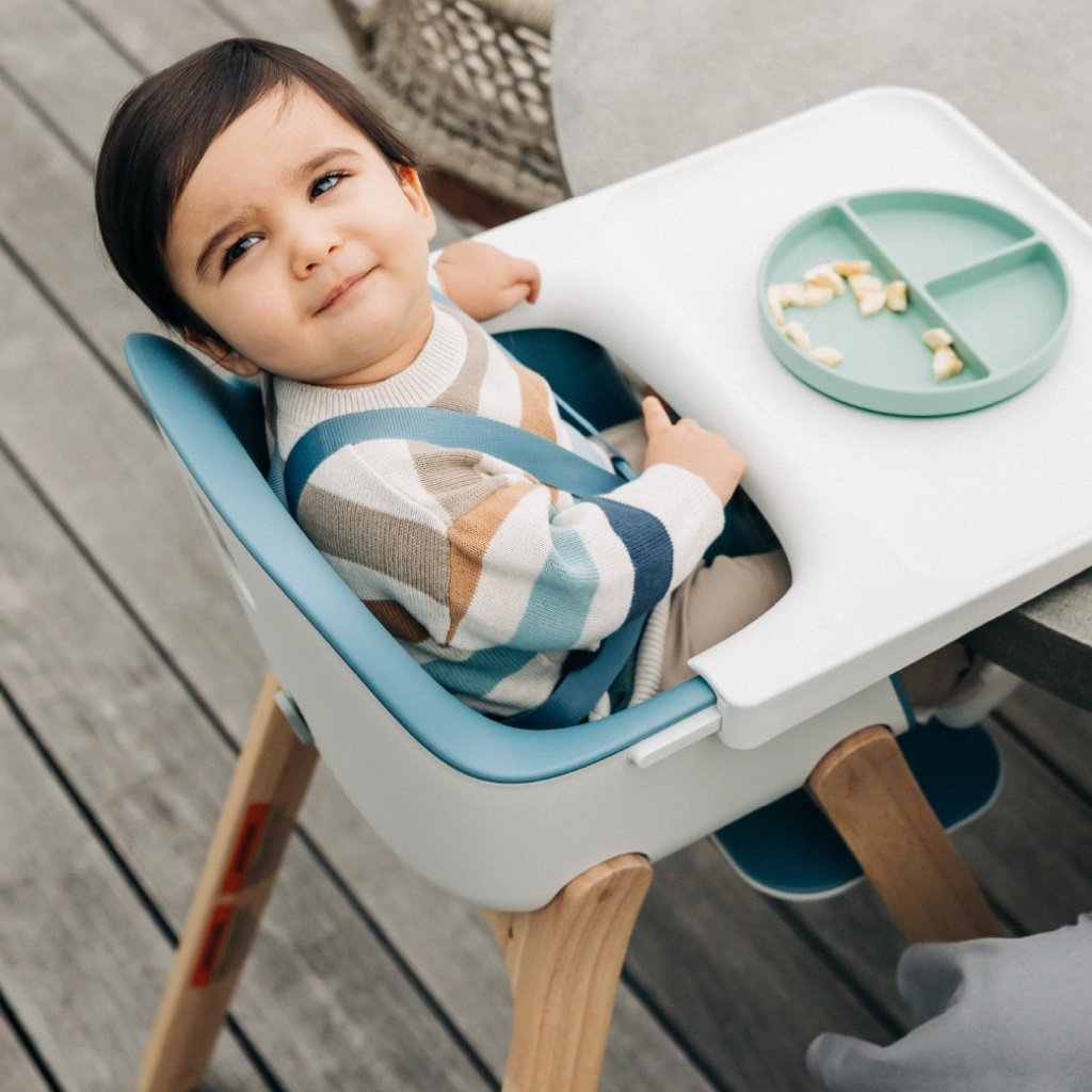 La silla sin juntas, el arnés adecuado para la comida y desmontable, y la bandeja apta para el lavavajillas permiten una limpieza rápida y fácil.