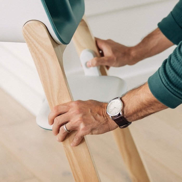 Reposapiés rotatorio con posición dual para colocar los pies cómodamente y crecer con los niños. Pendiente de patente.