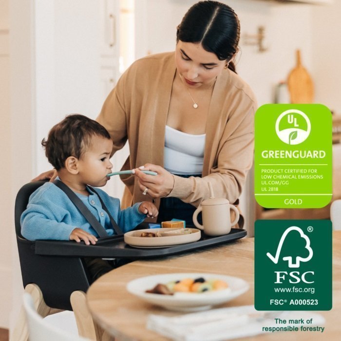 Certificado por GREENGUARD® Gold, JPMA, y FSC® para que el bebé tenga un espacio seguro y sostenible en el que sentarse y comer