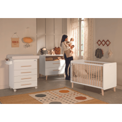 La cuna está realizada con haya y MDF lacado en color blanco y cera natural. Su somier tiene tres posiciones con patas fijas. Esta cuna puede complementarse con el opcional de cambiador cuna.