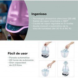 Silencioso humidificador que te permite comprobar la atmósfera de la habitación de tu bebé y asegurarle un aire saludable mientras duerme.