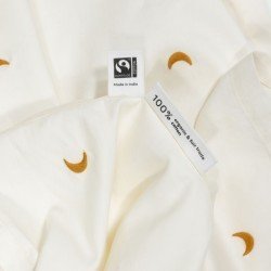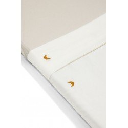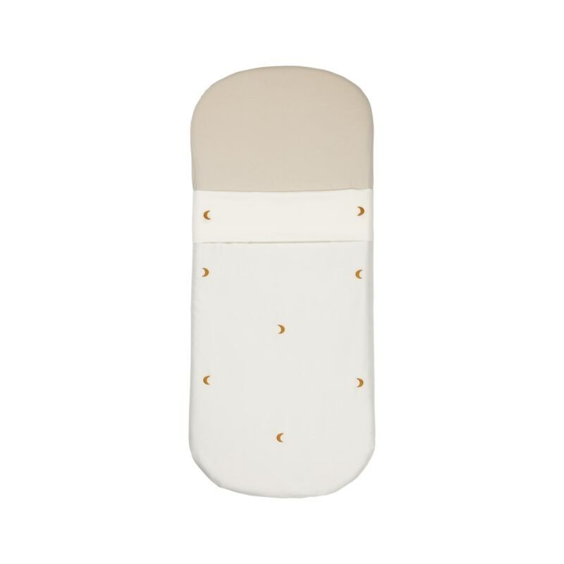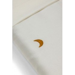 Esta sábana, elaborada con suavísimo satén de algodón y con un divertido bordado de lunas, añade un toque de magia al capazo de tu cochecito.