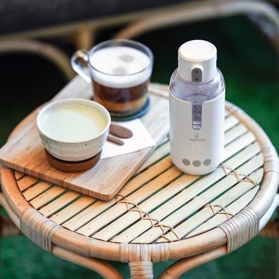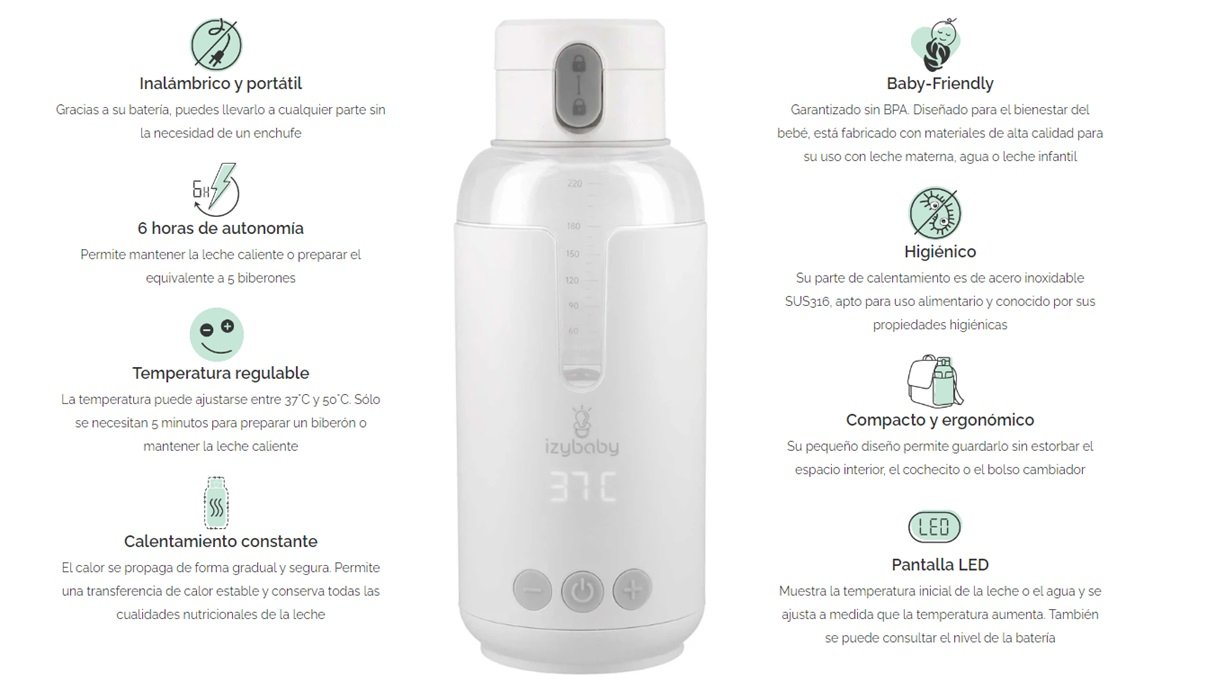 Calienta biberones portátil e inalámbrico, compatible con la leche materna, el agua o la leche infantil, y con batería integrada con 6 horas de autonomía. Recargable mediante cable USB-C (incluido).