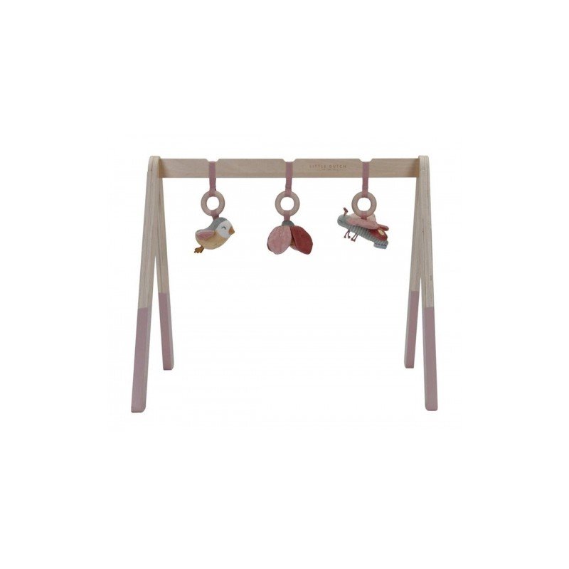 Gimnasio de madera para bebés con un diseño moderno. Está preparado para colgar distintos juguetes colgantes y estimular habilidades visuales y motoras cuando intente alcanzarlos.