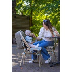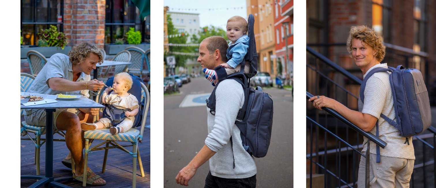 La mochila Hero se convierte en una práctica trona de viaje. Su sistema se adapta a la mayoría de sillas que encontrarás en estos establecimientos. Además, mientras la utilizas como trona de viaje, puedes acceder al contenido de la mochila en la parte trasera de la silla.