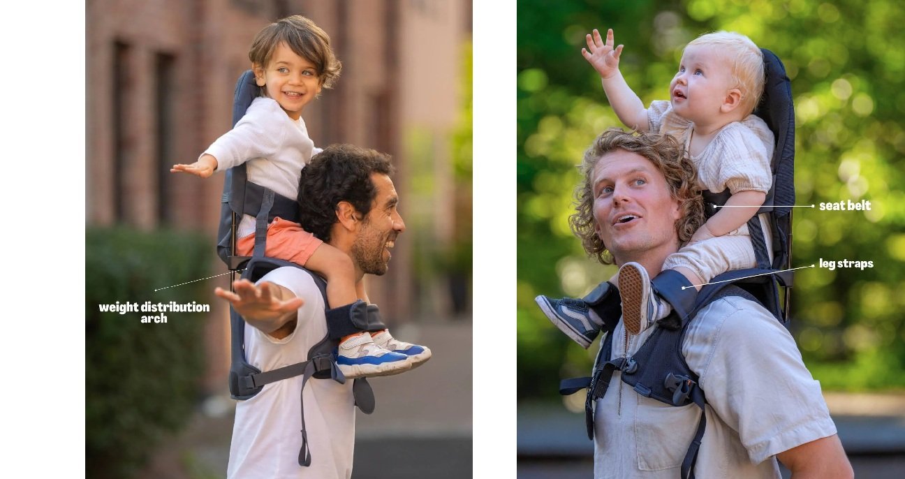 Se puede plegar plano fácilmente, así que se puede llevar durante las vacaciones, excursiones y escapadas! Llevarás al peque en una posición natural, encima de tus hombros, y con tus manos libres gracias a su sistema de sujeción segura. Desde los 6 meses a los 4 años y hasta un máximo de 18kg.