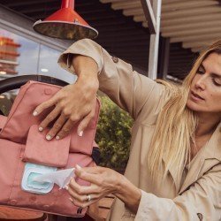 Bolsillo fácilmente accesible y especial para toallitas con cierre magnético.