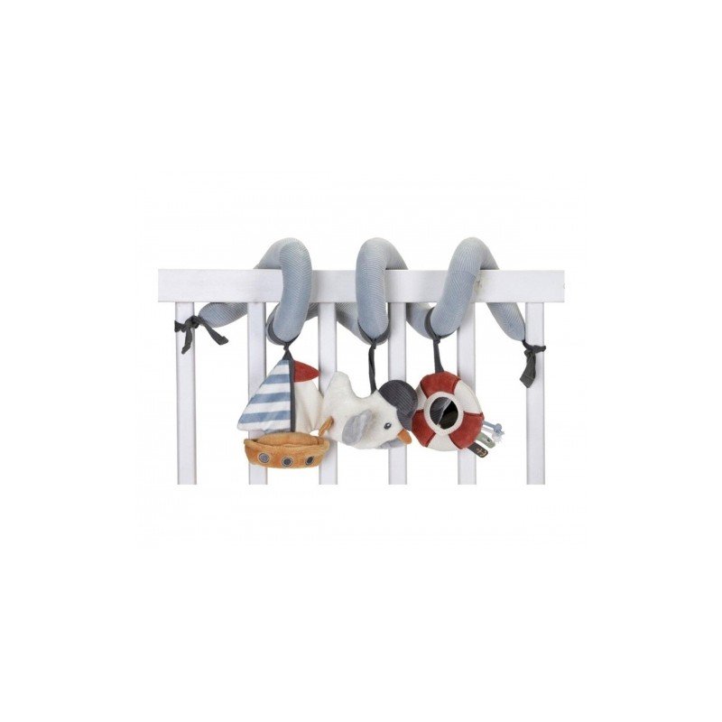 Espiral de actividades confeccionada en pana y algodón, presenta tres personajes sensoriales diferentes, una gaviota, un velero y un salvavidas que hace un sonido de traqueteo.