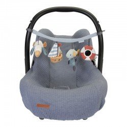 Cuenta con cuatro juguetes colgantes diferentes para mirar, agarrar y jugar, incluyendo un pelícano, un velero, dos peces y un espejo en forma de salvavidas.