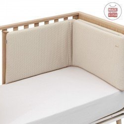 El protector, fabricado con tejido cuyo interior está acolchado con fibra hueca para amortiguar los posibles golpes del bebé contra la cuna, los cuales se producen por los simples movimientos del bebé cuando está dentro de la cuna.