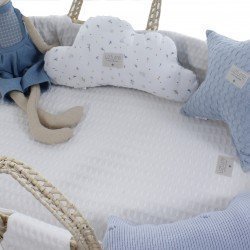 Conjunto de capazo compuesto por capazo de mimbre con sus vestiduras de la colección Mencia y colchón. Ideal para esos primeros meses del bebé y todo un capricho en la habitación. La colcha y la almohada son reversibles, en todos los colores, el reverso es en beige.